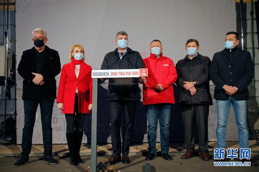 12月6日,在羅馬尼亞首都布加勒斯特,羅馬尼亞最大反對黨社會民主黨主席喬拉庫(左三)向媒體發表講話。新華社發(克里斯泰爾攝)