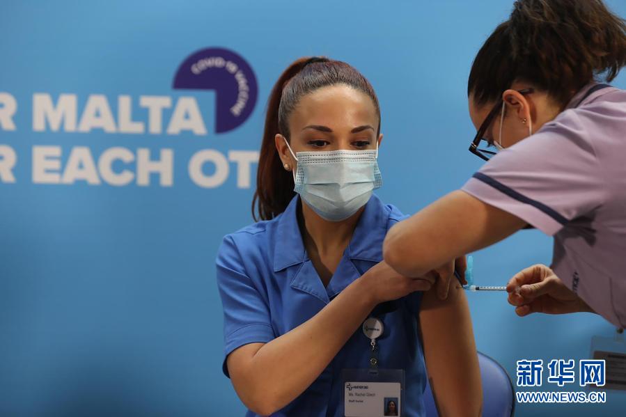 12月27日,在馬耳他瓦萊塔,國(guó)立圣母醫(yī)院護(hù)士蕾切爾·格雷奇接種新冠疫苗。新華社發(fā)(喬納森·博格 攝)
