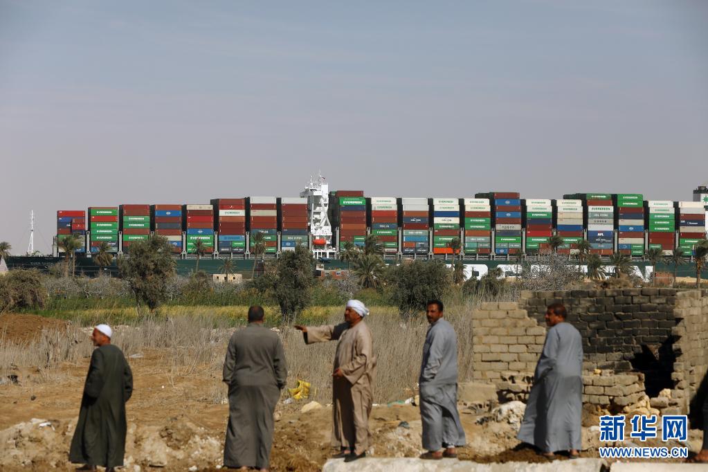 這是3月29日拍攝的移動至埃及蘇伊士運河正常航道上的重型貨輪。新華社發(艾哈邁德·戈馬 攝)